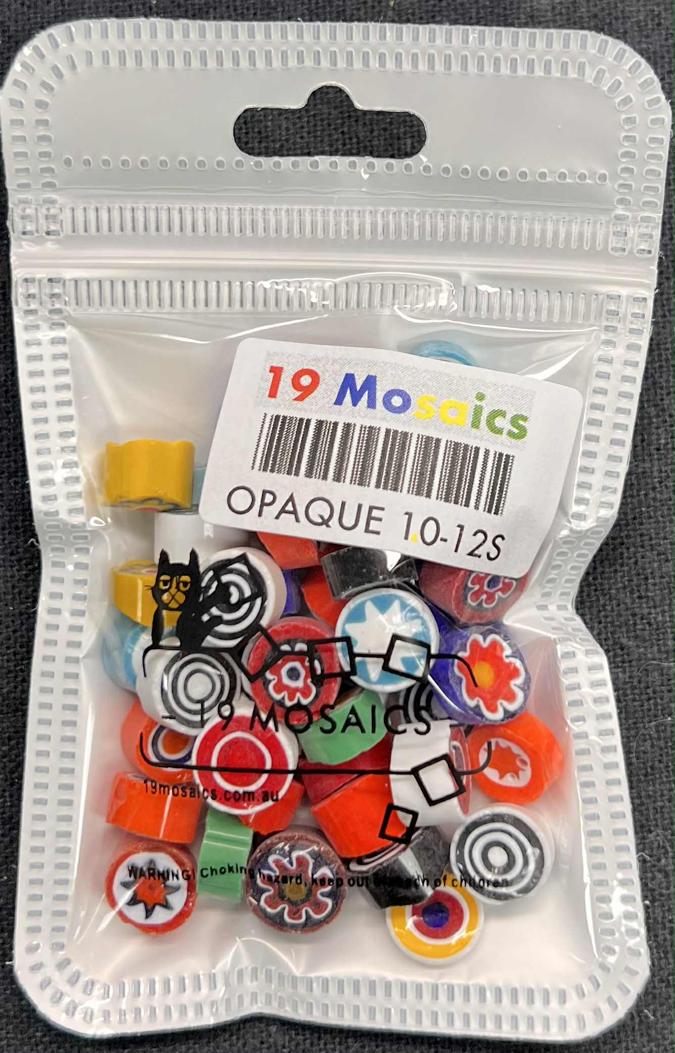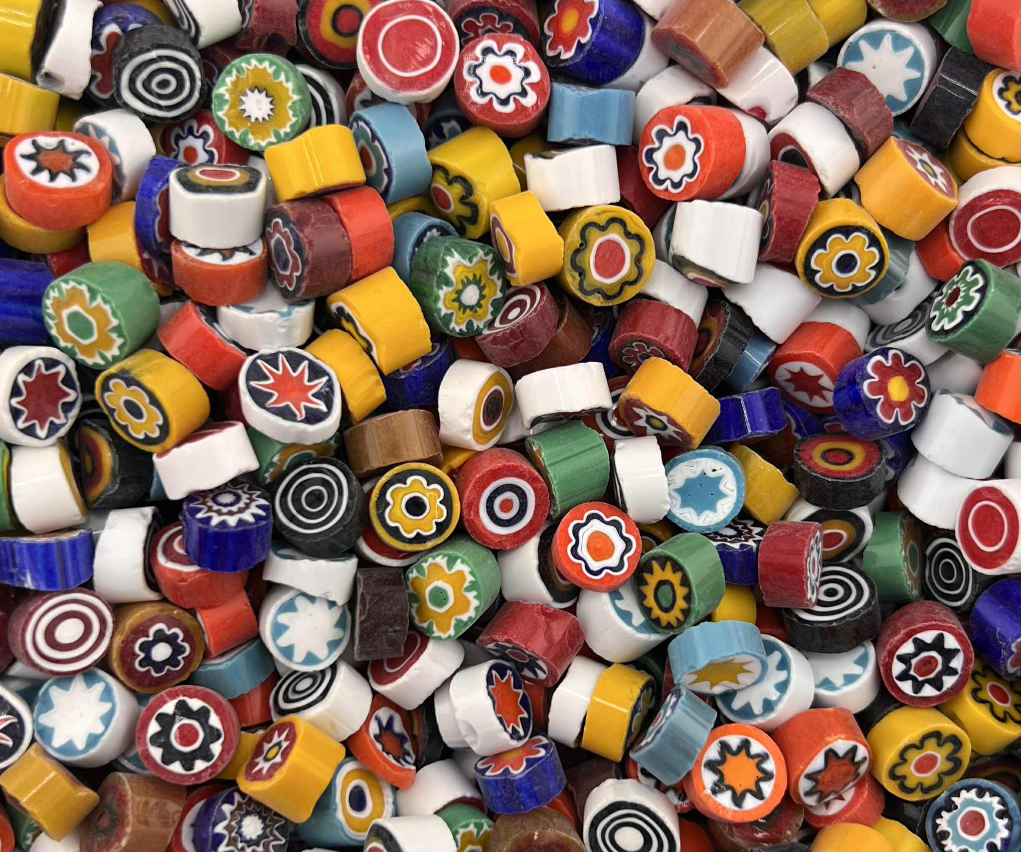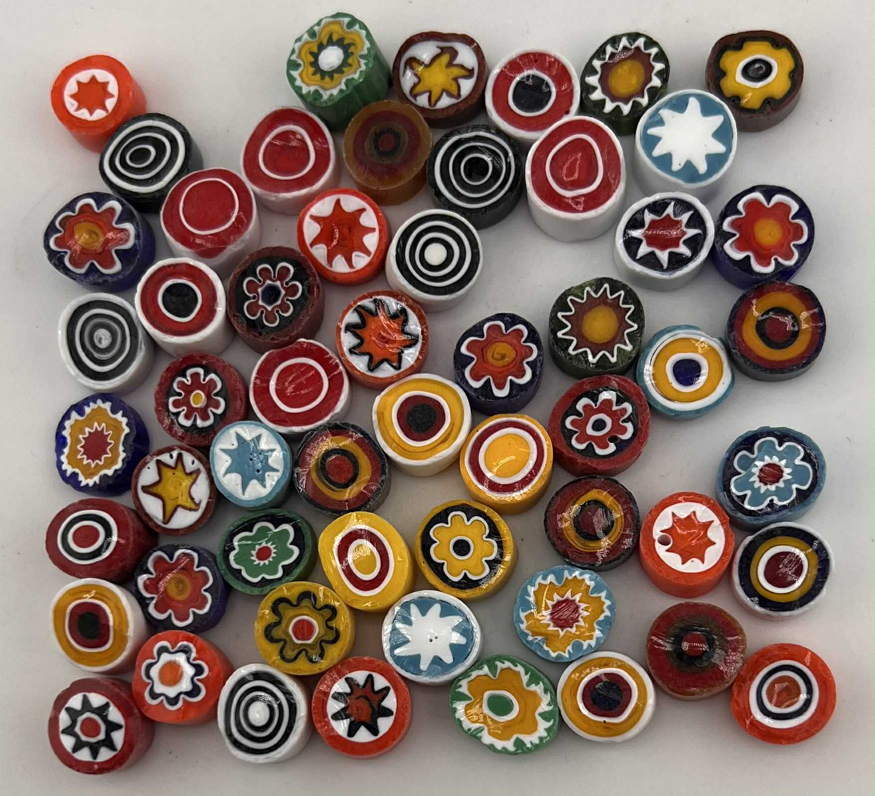 Italian Effetre Murano Millefiori with a matte sawn face, characterised by a solid opaque colour and a floral, heart, star and swirl pattern.