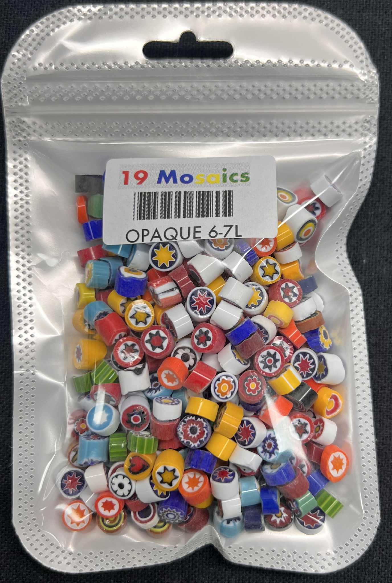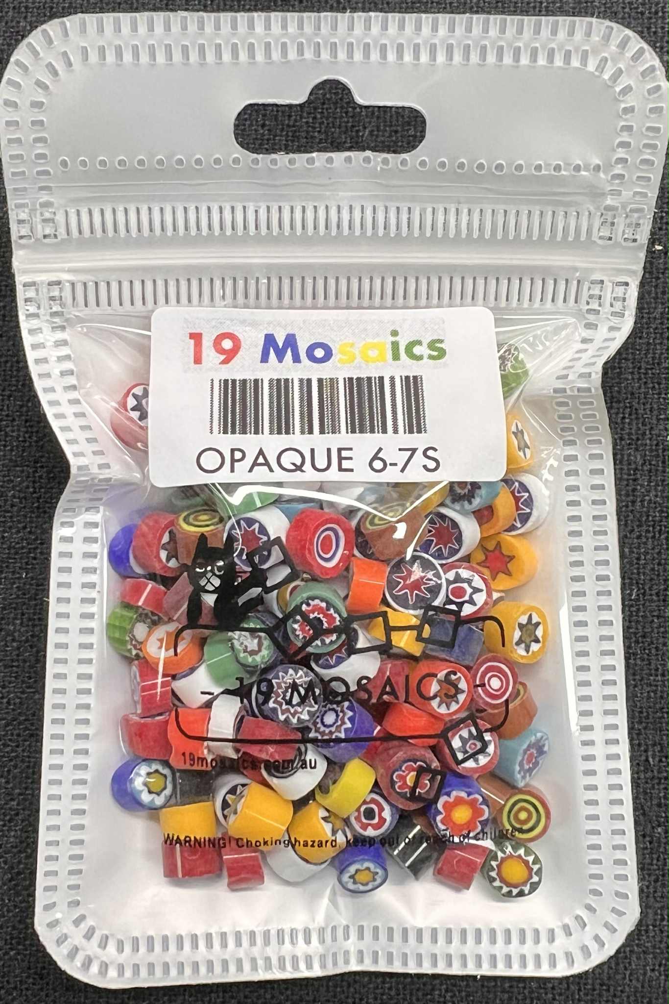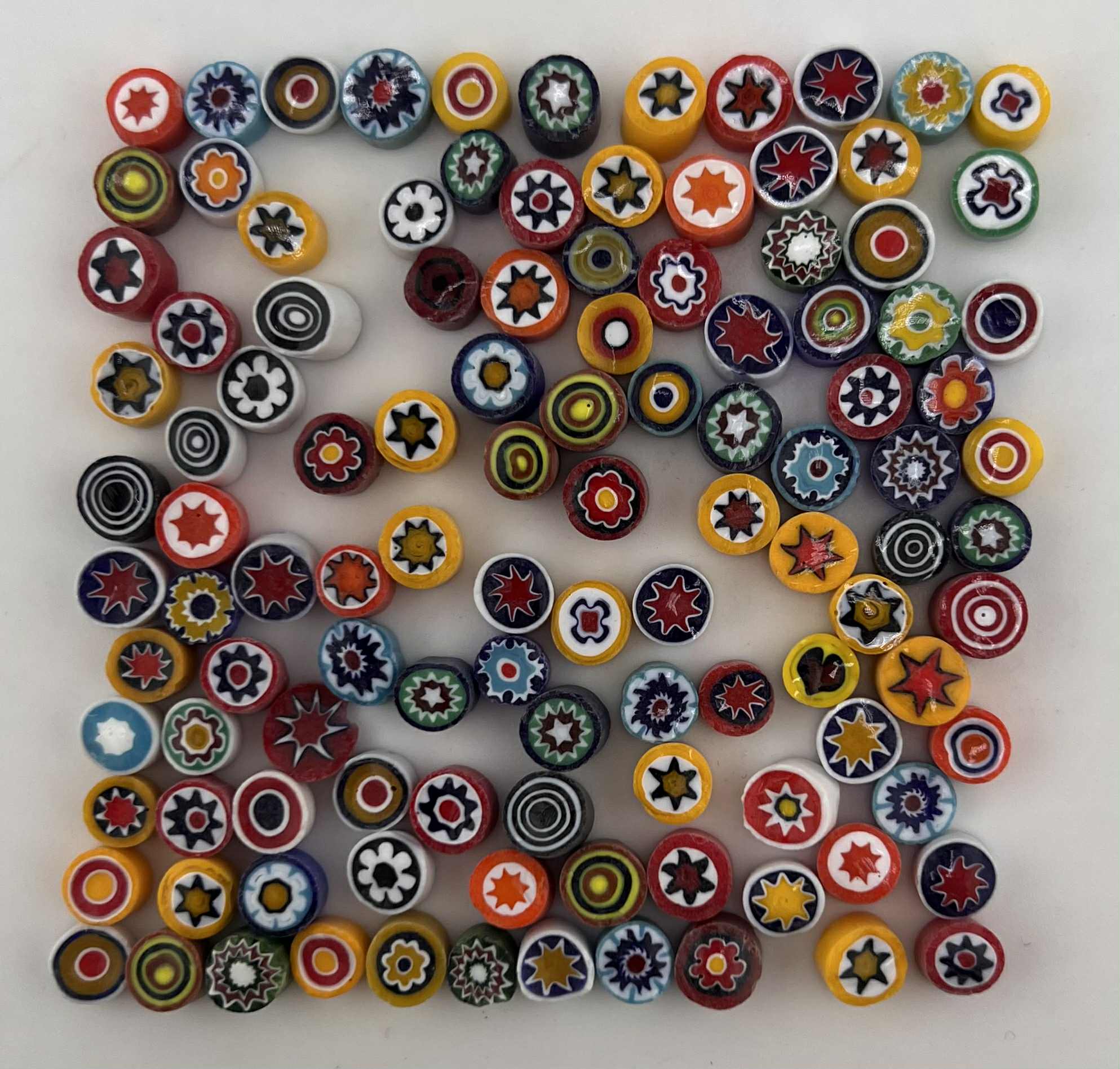 Italian Effetre Murano Millefiori with a matte sawn face, characterised by a solid opaque colour and a floral, heart, star and swirl pattern.