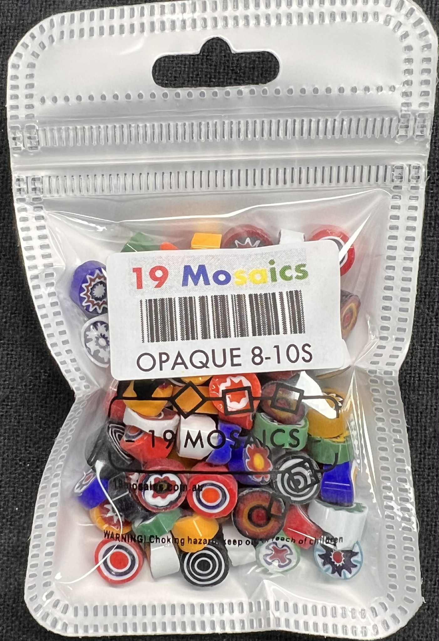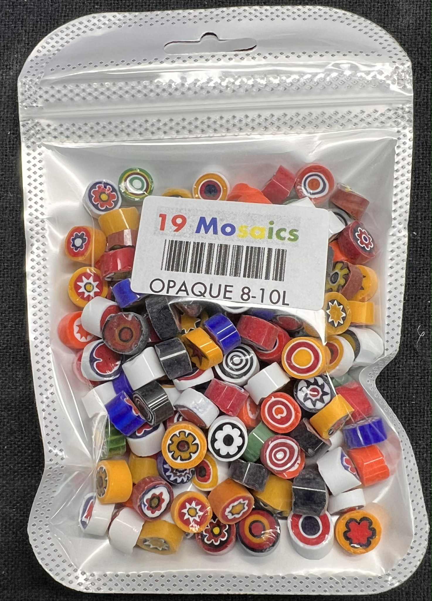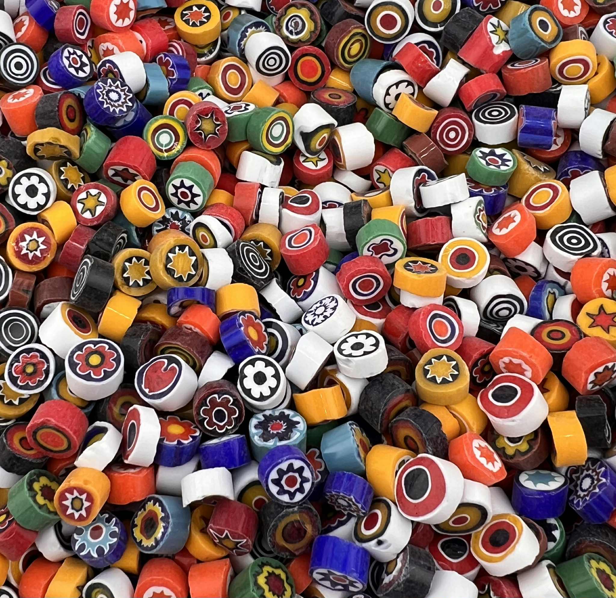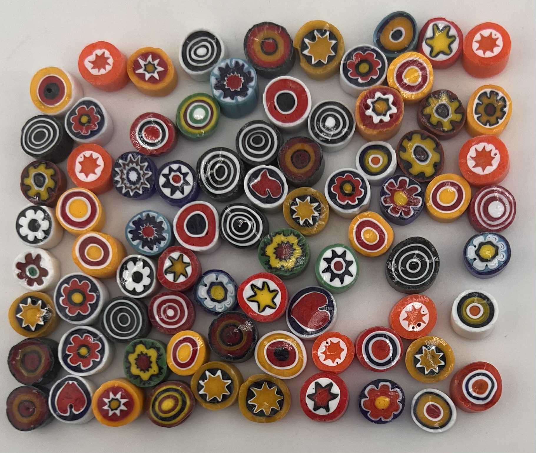 Italian Effetre Murano Millefiori with a matte sawn face, characterised by a solid opaque colour and a floral, heart, star and swirl pattern.