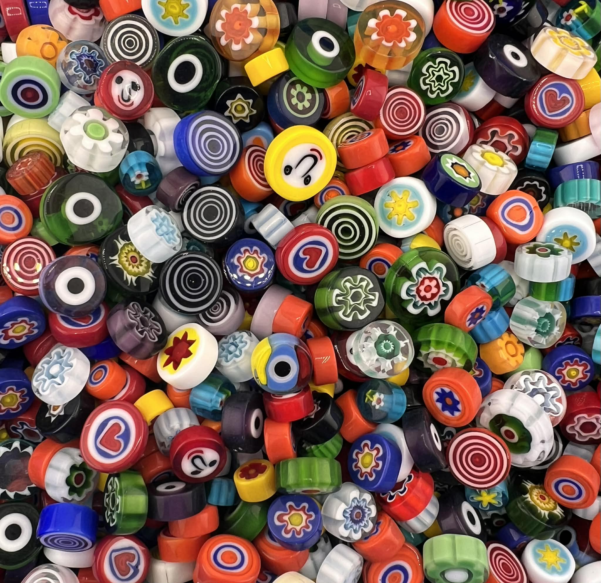 The 19 Mosaics brand of millefiori is brightly coloured glass with various designs.