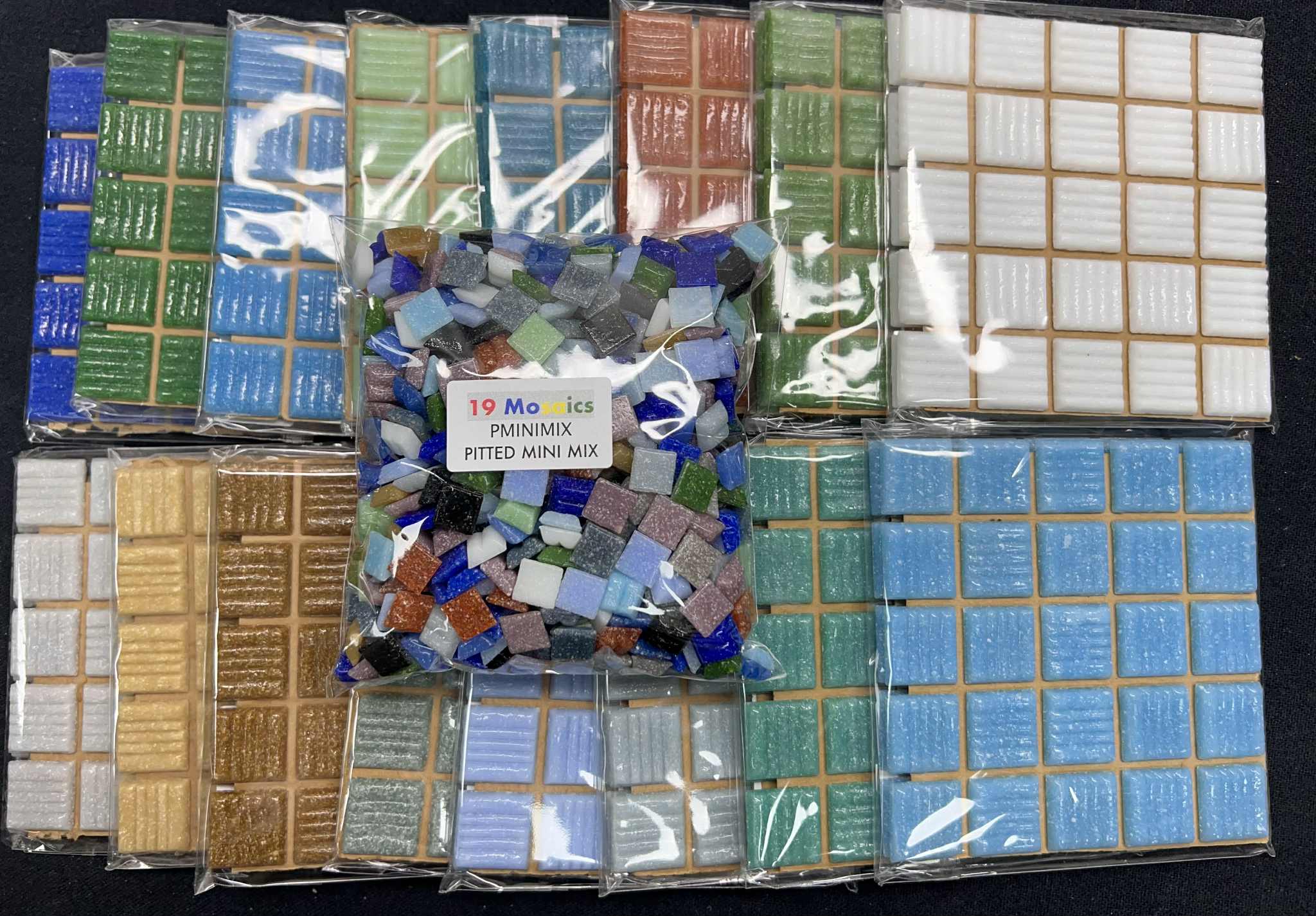- 16 x 50 packs of Pitted Top Vitreous tiles of various colours (16 colours)