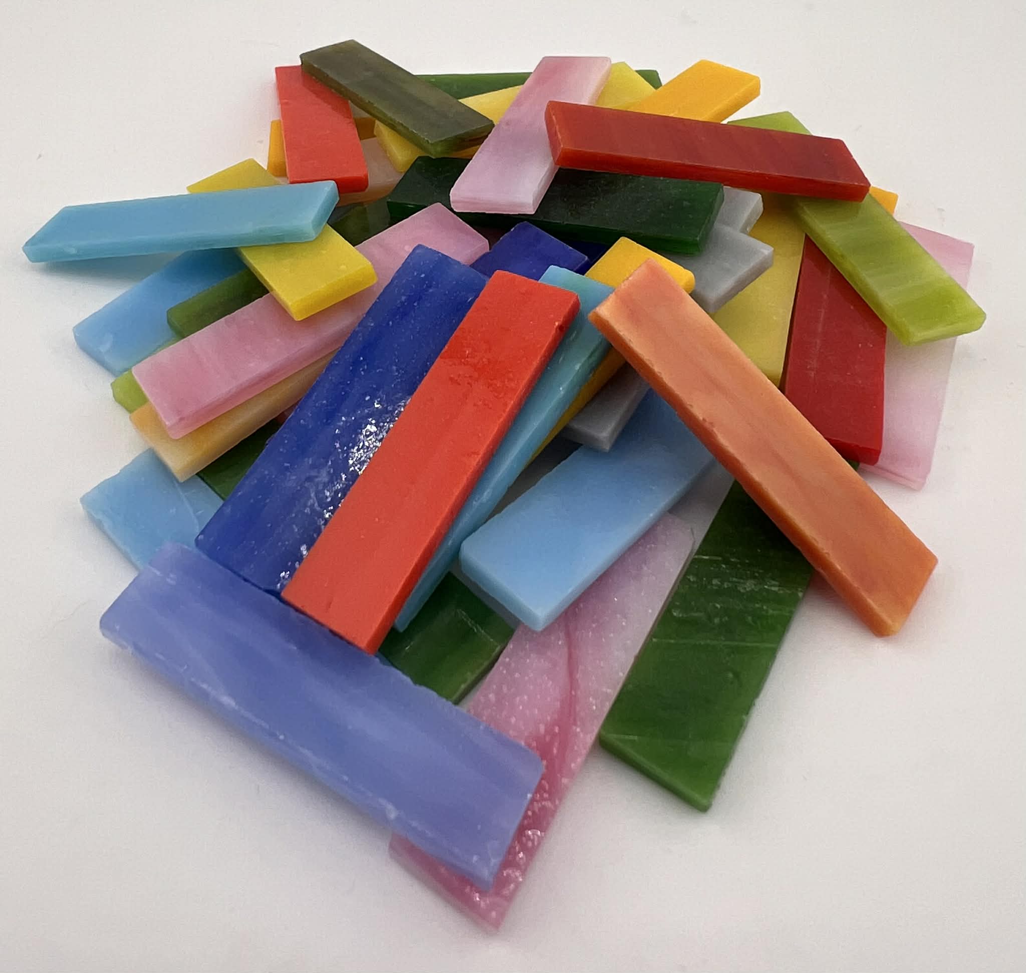 A wonderful mix of colourful translucent and transparent strips. Use as strips or cut and shape, the perfect addition to your Mosaic Tile Stash