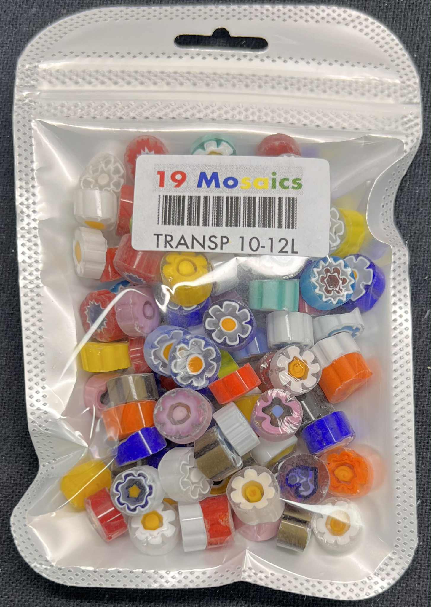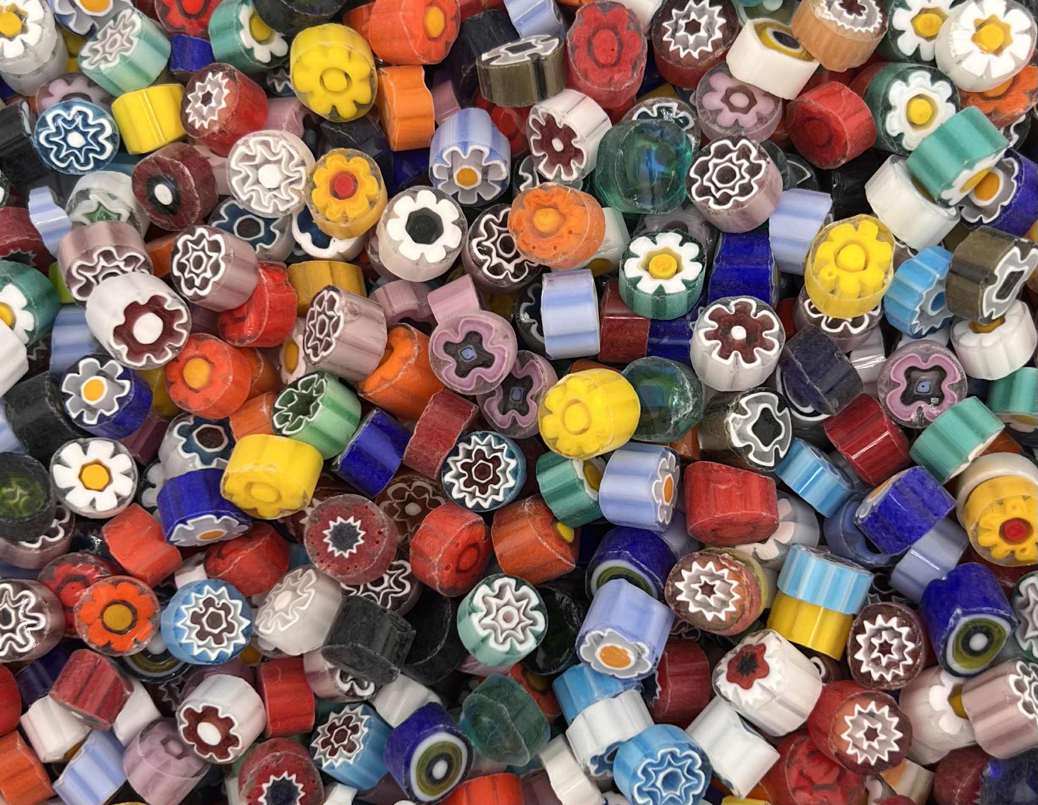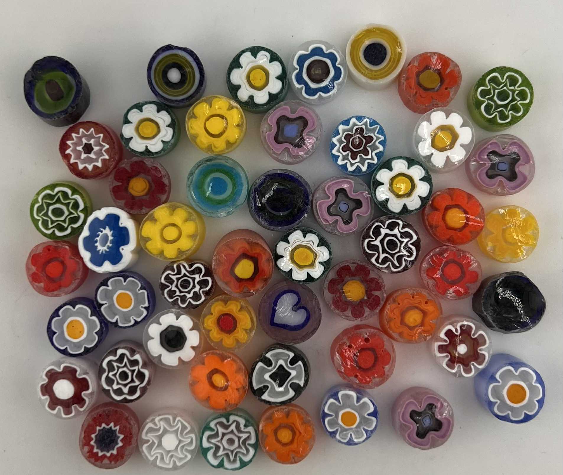 Italian Effetre Murano Millefiori with a matte sawn face, characterised by a solid transparent colour and a floral, heart, star and swirl pattern.