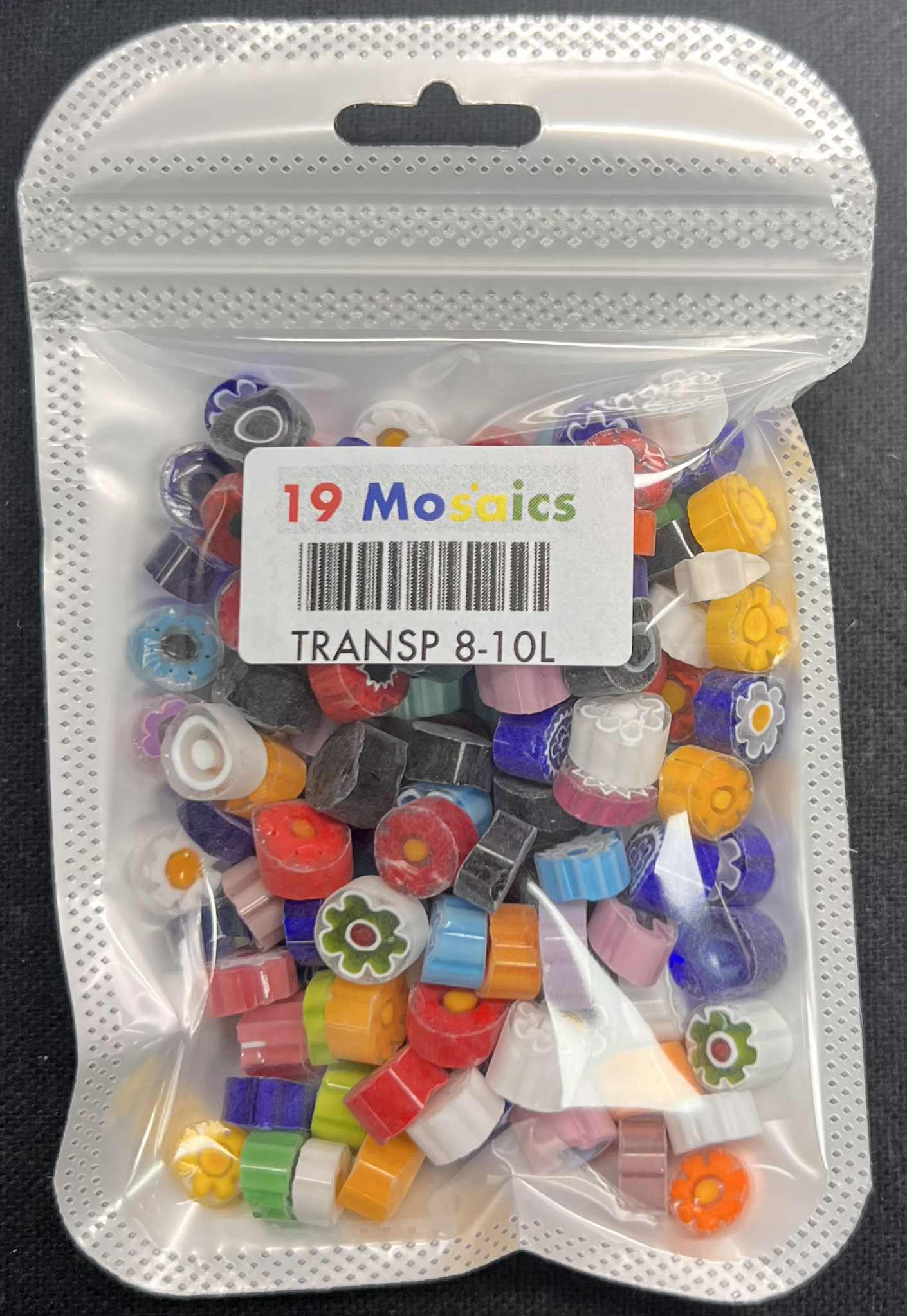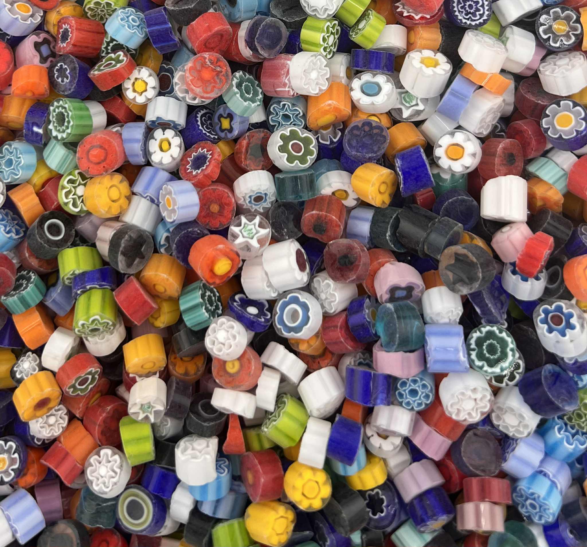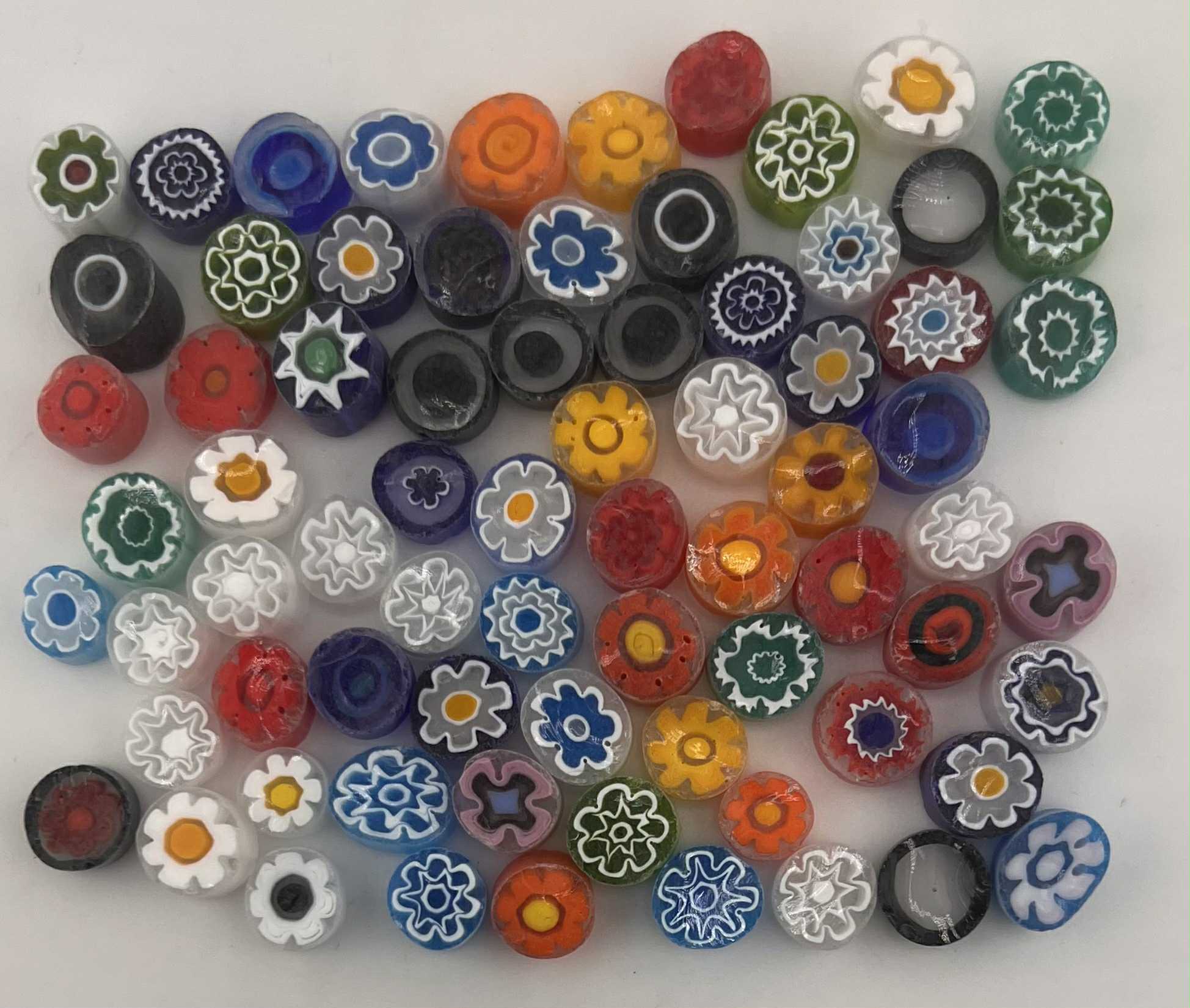 Italian Effetre Murano Millefiori with a matte sawn face, characterised by a solid transparent colour and a floral, heart, star and swirl pattern.