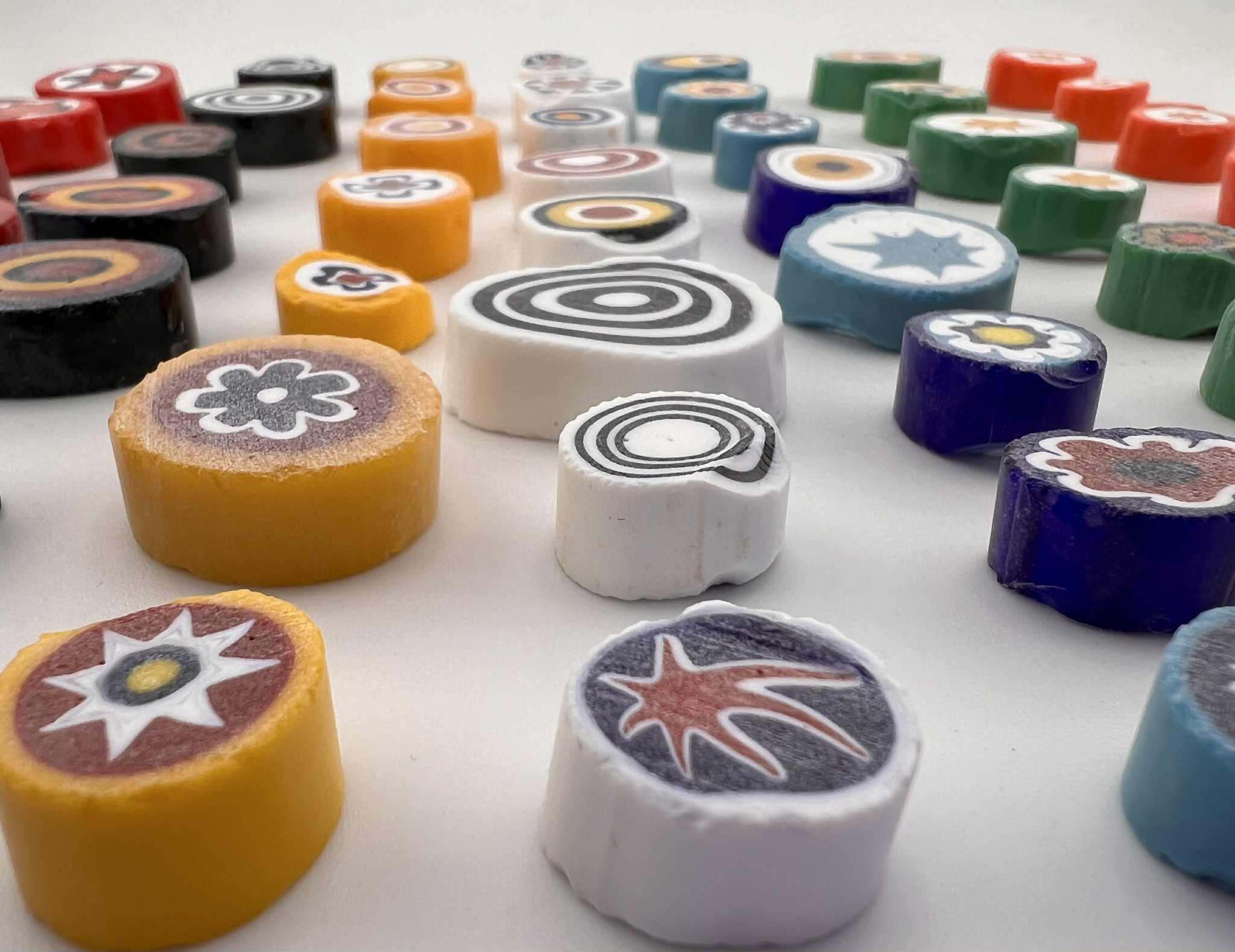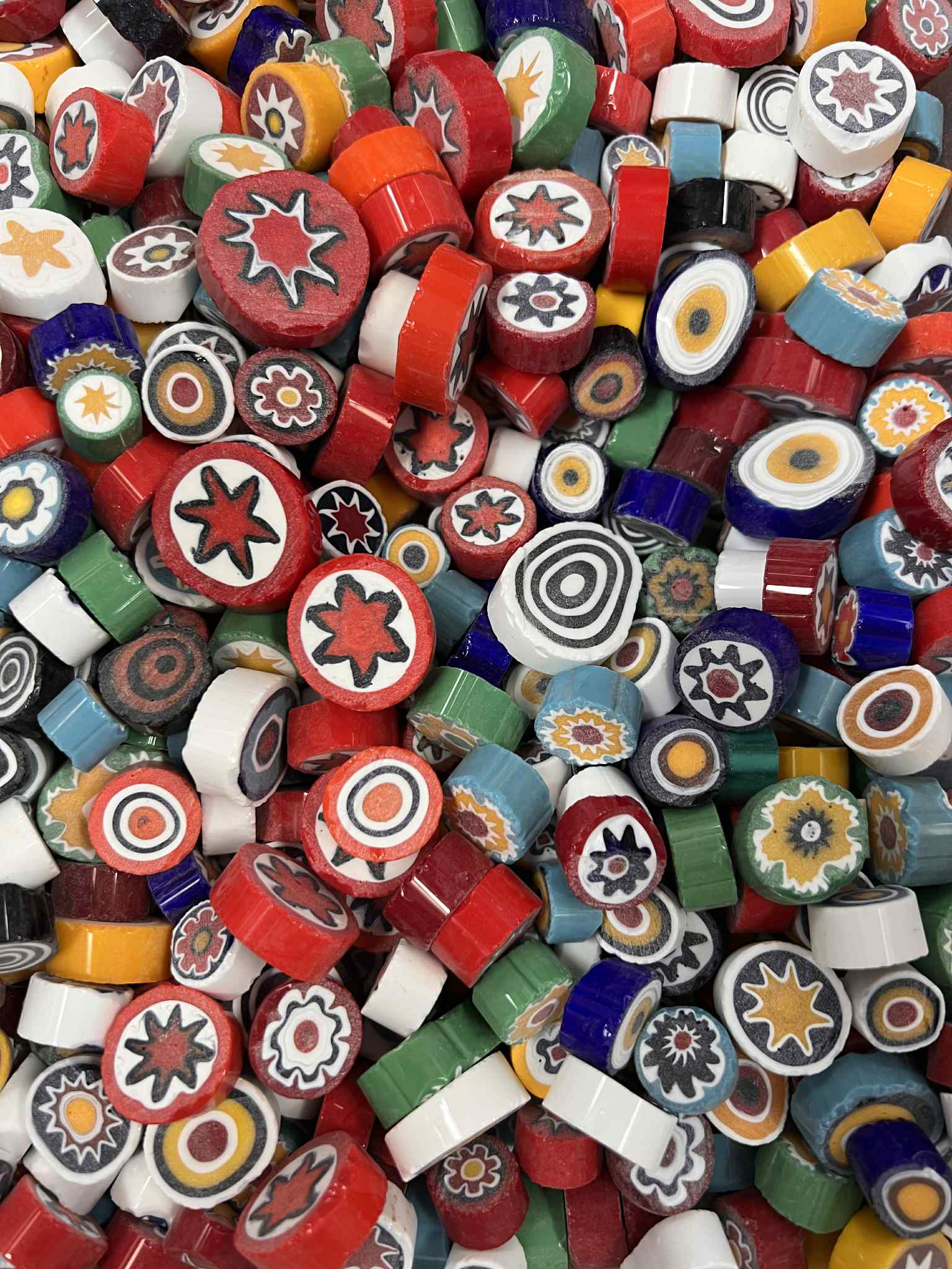 Italian Effetre Murano Millefiori, large format with a matte sawn face, characterised by a solid, opaque colour and a floral, star and swirl pattern.
